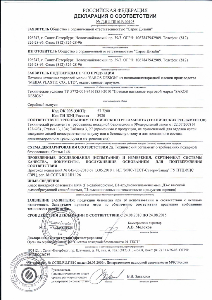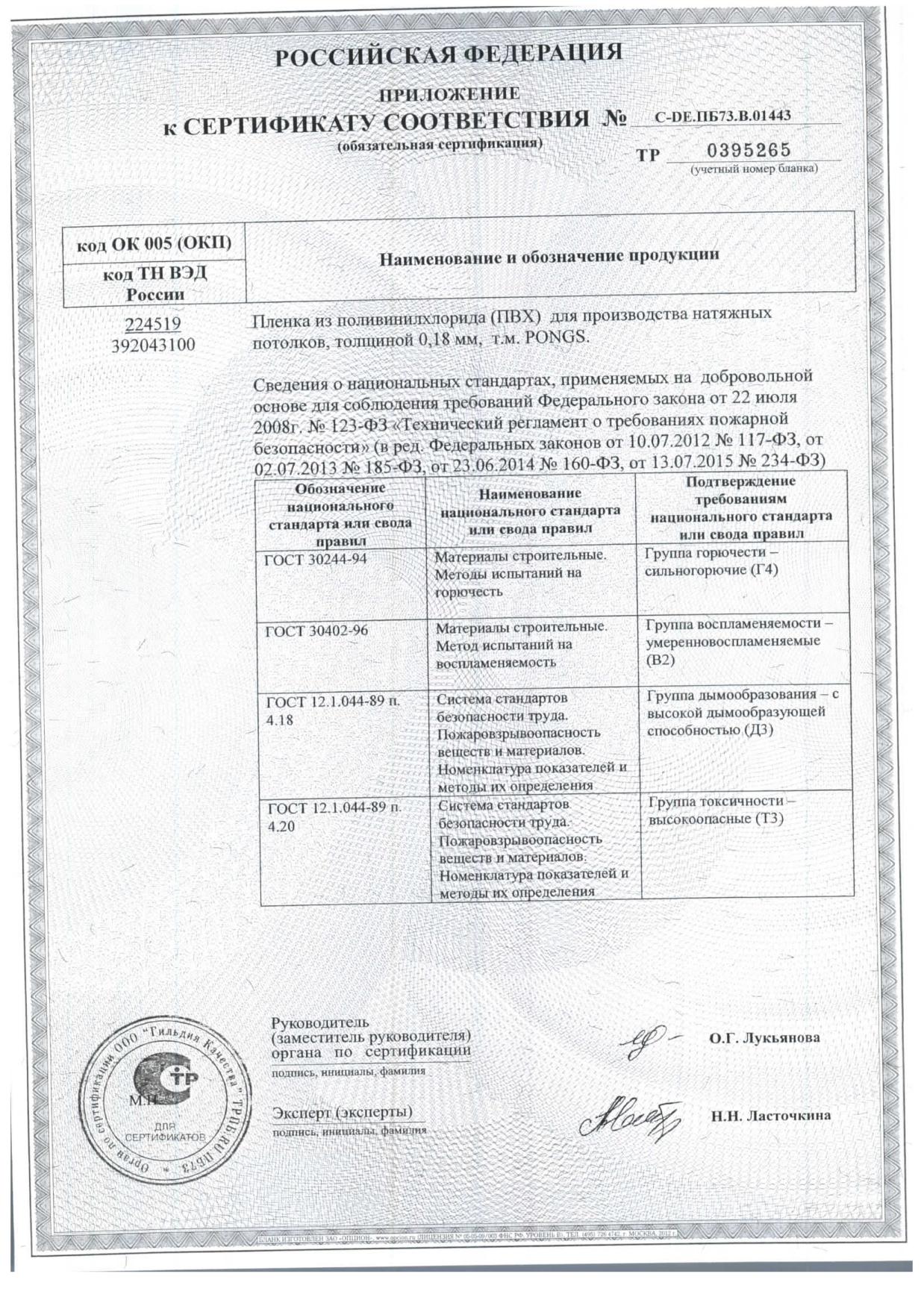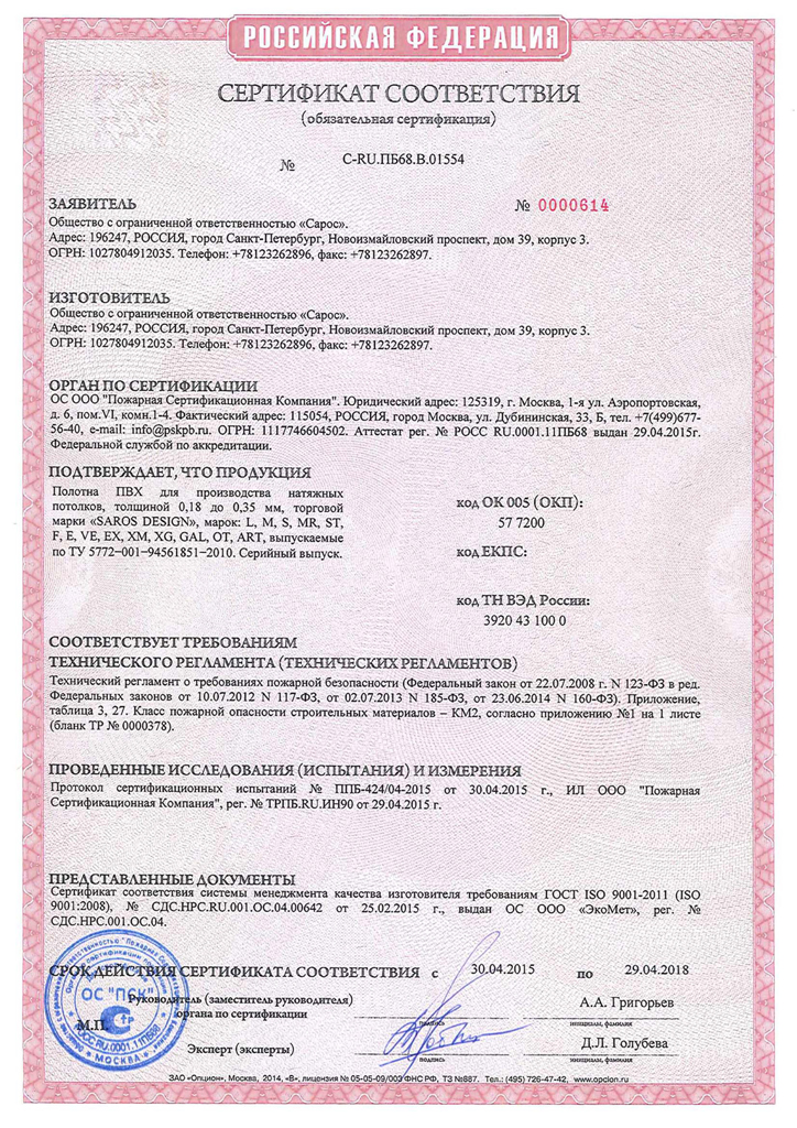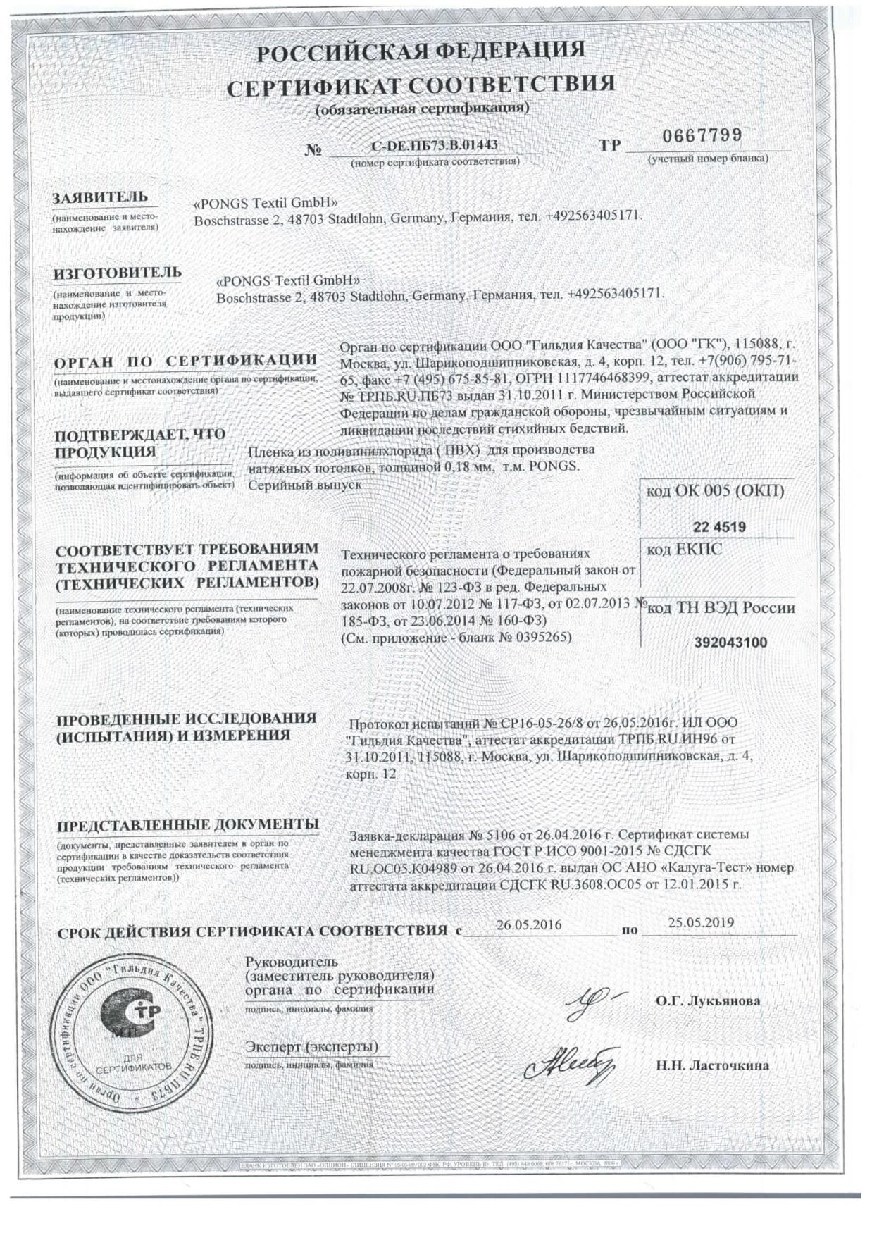 Наша компания работает только с добросовестными заводами-изготовителями материалов для монтажа потолков. Поэтому мы можем с уверенностью гарантировать безупречное качество нашего товара. И не только на словах – качество нашей продукции подтверждено многочисленными сертификатами соответствия.